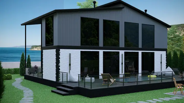 • Фасад: комбинированный, сайдинг полипропиленовый + реечные WPC-панели