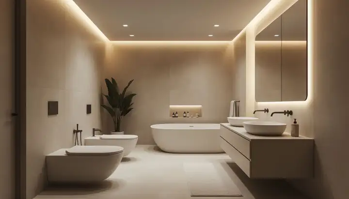 Освещение — это важный аспект, который влияет на функциональность и атмосферу. Современные решения предлагают многослойные подходы, сочетая общий свет с акцентами на зоне у зеркала и расслабляющим светом. Ночные подсветки мягко адаптируют пространство к тёмному времени суток.